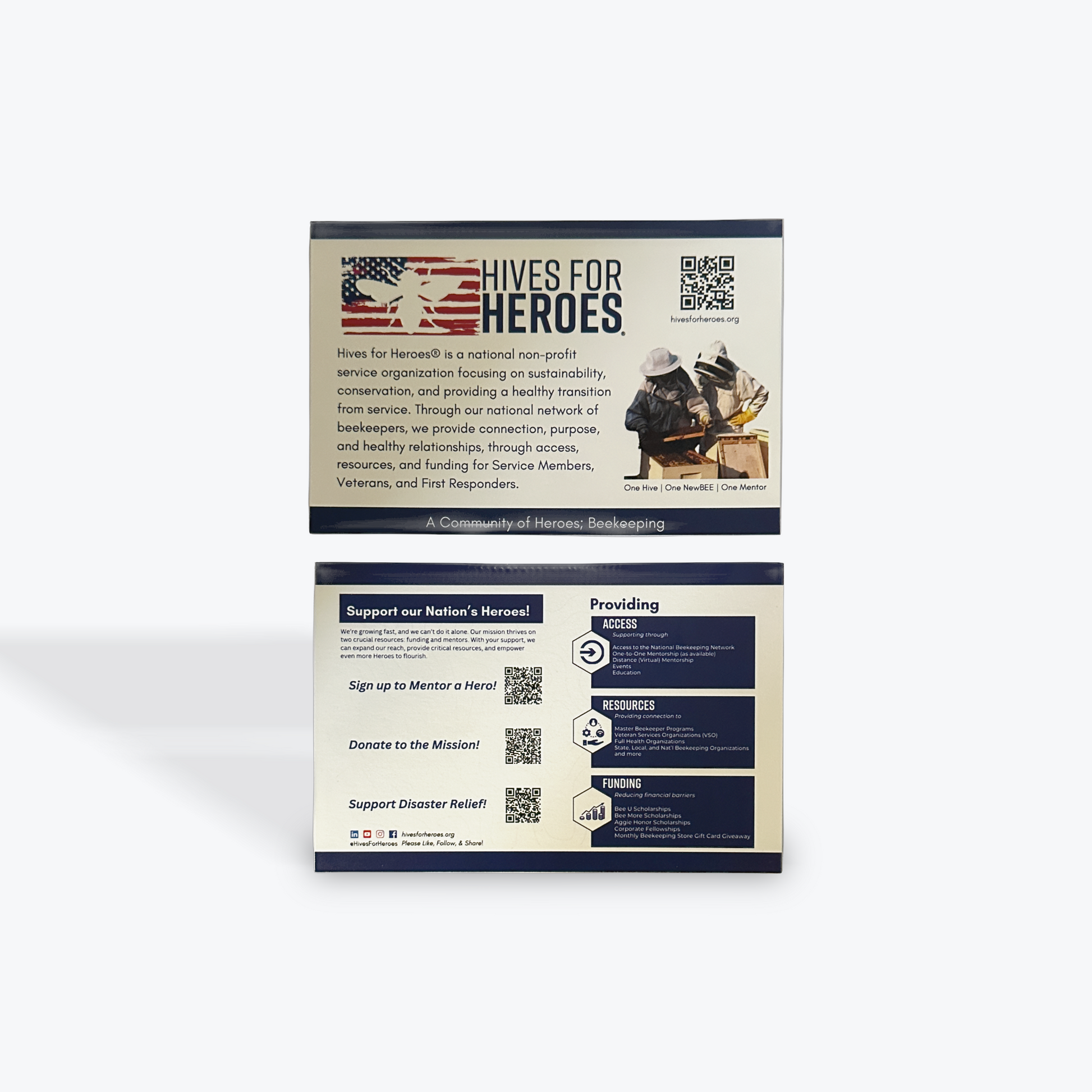 Spread awareness and show your support for Veterans, First Responders, and their families with the Hives for Heroes Postcards. Designed to educate and inspire, these postcards highlight the mission of Hives for Heroes — a national non-profit dedicated to sustainability, conservation, and providing meaningful opportunities for those transitioning from service. Featuring clear messaging, impactful imagery, and QR codes for direct engagement, each postcard is a tool to connect your community with resources, mentorship programs, and funding opportunities for heroes. Perfect for mailing, events, or personal outreach, these postcards empower supporters to take action and share the mission with others, fostering a stronger network of care and recognition for our nation’s heroes.